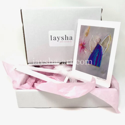 Introducing our exquisite Angel Gift Box, a harmonious blend of art and spirituality. Delight in the serenity of a luxury Angel print, thoughtfully complemented by a small easel for display, a delicate white feather, and a divine Angel message. All wrapped in tissue to create a truly heavenly gifting experience.